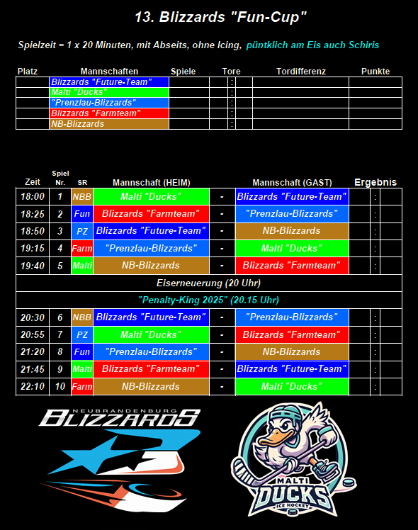 Wie in jedem Jahr "darf" ein Gast unserem witzigem Eishockeyturnier beiwohnen und da der Herr Malte Ernestus im letzten Jahr die Frechheit besaß, erstmals den Blizzards den Titel zu entreißen 😜🏆, müssen die Malti "Ducks" als Titelverteidiger natürlich erneut anreisen! Wieder werden es die Blizzards versuchen, dem Team aus Rostock, welches mit vielen Anfängern aber auch dem maximalen Gegenteil besetzt ist/war, das Leben schwer zu machen! Fakt ist, es hat richtig Spaß gemacht und wir freuen uns auf euch und unsere Blizzards! Leider ist die Liste mit Absagen bereits sehr lang (viele verletzte Spieler, Weihnachtsferien etc.), was wir mehr als schade finden!