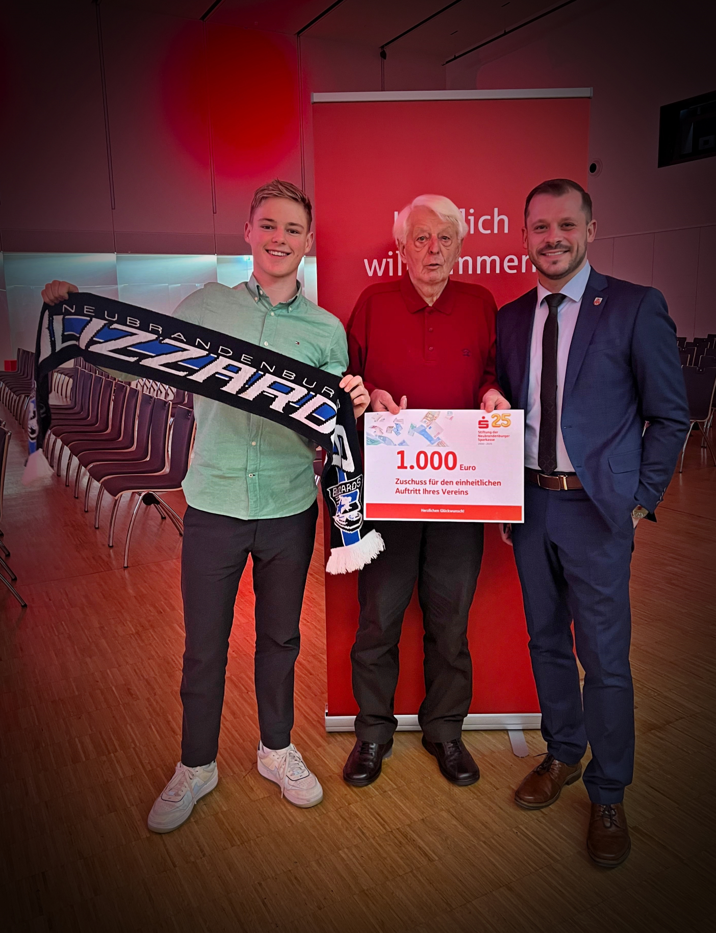 So sollte uns auch das "Losglück" ereilen. Bei der Jubiläums-veranstaltung, anlässlich des 25. Jahrestages der Stiftung der Neubrandenburger Sparkasse, durften sich 25 Vereine über jeweils 1.000,- € freuen. Über 50 Vereine waren mit von der Partie und wir gehörten zu den Glücklichen. Stellvertretend für die Blizzards waren Lennart #57 und Christian Meißner, sowie Jens Brammann vor Ort und durften den Check in Empfang nehmen.