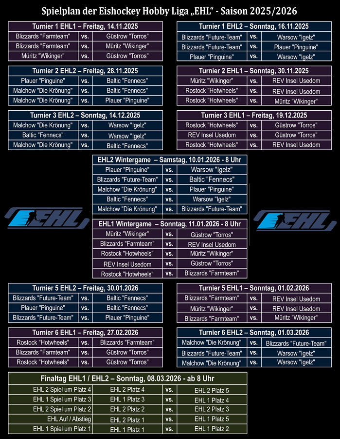 Die Plätze 1-4 der Vorsaison wurden in die "EHL 1" gesteckt und nach Rücksprache auch die "Schamasen" vom REV, da dort ein gutes spielerisches Niveau vorherrscht. Die 3 anderen neuen Teams spielen in der "EHL 2" und das Feld wird von den "Igelz" und dem "Future-Team" komplettiert. Die "EHL 1" spielt den Meister unter sich aus, gleiches gilt für die "EHL 2". Es wird ein Spiel um den Auf- und Abstieg am Finaltag in Malchow geben. 🏒🥅Spannung ist also bis zum Ende garantiert!🥅🏒
